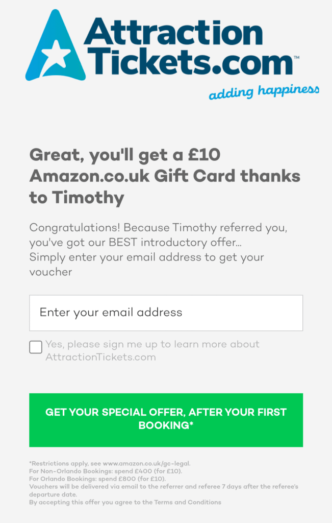 Get a £10 Amazon Giftcard when you make your first purchase at attractiontickets.com using our refer a friend link below: